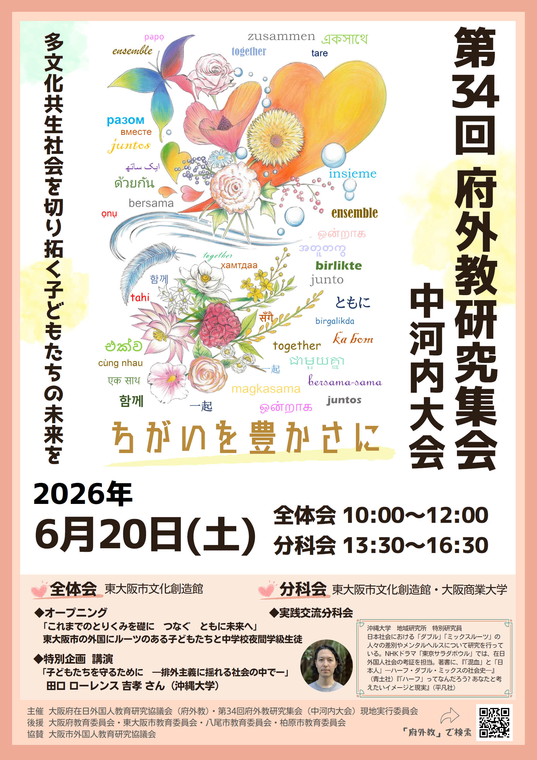 | 全体会は、東大阪市文化創造館 大ホールを会場に行います。 オープニングでは、「これまでのとりくみを礎に つなぐ ともに未来へ」をテーマに 東大阪市の外国にルーツのある子どもたちと中学校夜間学級生徒のみなさんの舞台発表があります。 内容は、楽器演奏、龍踊りと夜間学級の生徒さんによる作文の発表を予定しています。 特別企画では、田口 ローレンス 吉孝さん(沖縄大学)に「子どもたちを守るために―排外主義に揺れる社会の中でー」を テーマにご講演をいただきます。 講師の田口 ローレンス 吉孝さんは、戦後日本社会における「ダブル」「ミックスルーツ」の人々の差別や メンタルヘルスについて研究を行っておられ、近年は、アンケート調査を行い、その結果はひろく活用されています。 また、NHKドラマの「東京サラダボウル」では、在日外国人社会考証を担当するなど、多方面で活躍されています。 |