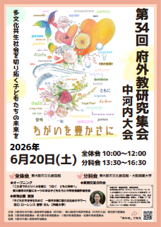 | 1.主催 大阪府在日外国人教育研究協議会 第34回府外教研究集会(中河内大会)現地実行委員会 協賛 大阪市外国人教育研究協議会 2.後援 大阪府教育委員会 東大阪市教育委員会・八尾市教育委員会・柏原市教育委員会 3.テーマ ちがいを豊かさに-多文化共生社会を切り拓く子どもたちの未来を- 4.期日 2026年6月20日(土) 5.会場 【全体会】 東大阪市文化創造館(〒577-0034大阪府東大阪市御厨南2-3-4) 近鉄奈良線「八戸ノ里駅」下車北へ約200m 【実践交流分科会】(予定) 東大阪市文化創造館(〒577-0034大阪府東大阪市御厨南2-3-4) 近鉄奈良線「八戸ノ里駅」下車北へ約200m 大阪商業大学(〒577-8505大阪府東大阪市御厨栄町4-1-10) 近鉄奈良線「河内小阪駅」下車北東へ約300m 近鉄奈良線「八戸ノ里駅」下車北西へ約700m 6.参加資料代 2,000円 7.日程・内容 (1)全体会10:00~12:00(受付 9:30) ・オープニング 「これまでのとりくみを礎に つなぐ ともに未来へ」 東大阪市の外国にルーツのある子どもたちと中学校夜間学級生徒 ・開会行事 ・特別企画 講演「子どもたちを守るために―排外主義に揺れる社会の中でー」 講師 田口ローレンス吉孝さん(沖縄大学) (2)実践交流分科会13:30~16:30(受付 13:00) A アイデンティティの育成 B 学力保障 C 集団づくり D 多文化共生の授業づくり E 進路保障 F 連携・協働 G 多文化共生教育との出会い |